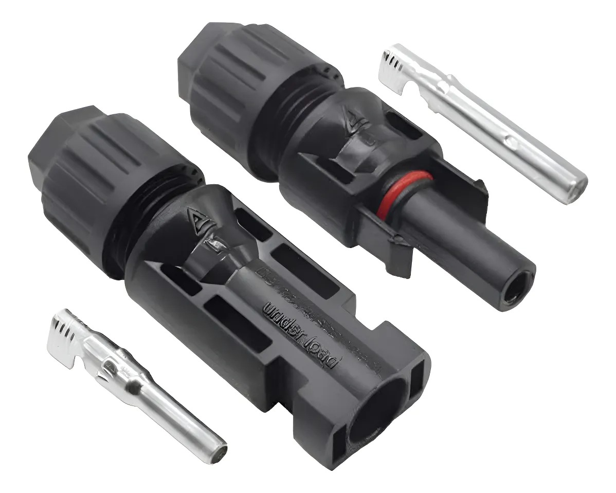 Conector MC4 simple, diseñado para realizar conexiones seguras y confiables entre paneles solares. Asegura una correcta conducción eléctrica y resistencia a condiciones exteriores como humedad y rayos UV.