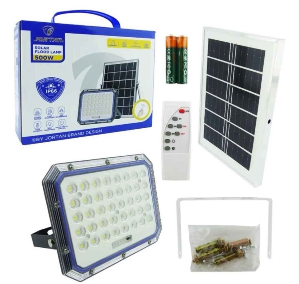 El Proyector Solar Jortan 500W es una solución de iluminación robusta y ecológica. Diseñado para ofrecer máxima luminosidad en áreas sin acceso a la red eléctrica, utiliza energía 100% solar para cargar su batería de litio de alta capacidad. Su instalación es sencilla gracias al panel solar separado y el kit de montaje incluido.